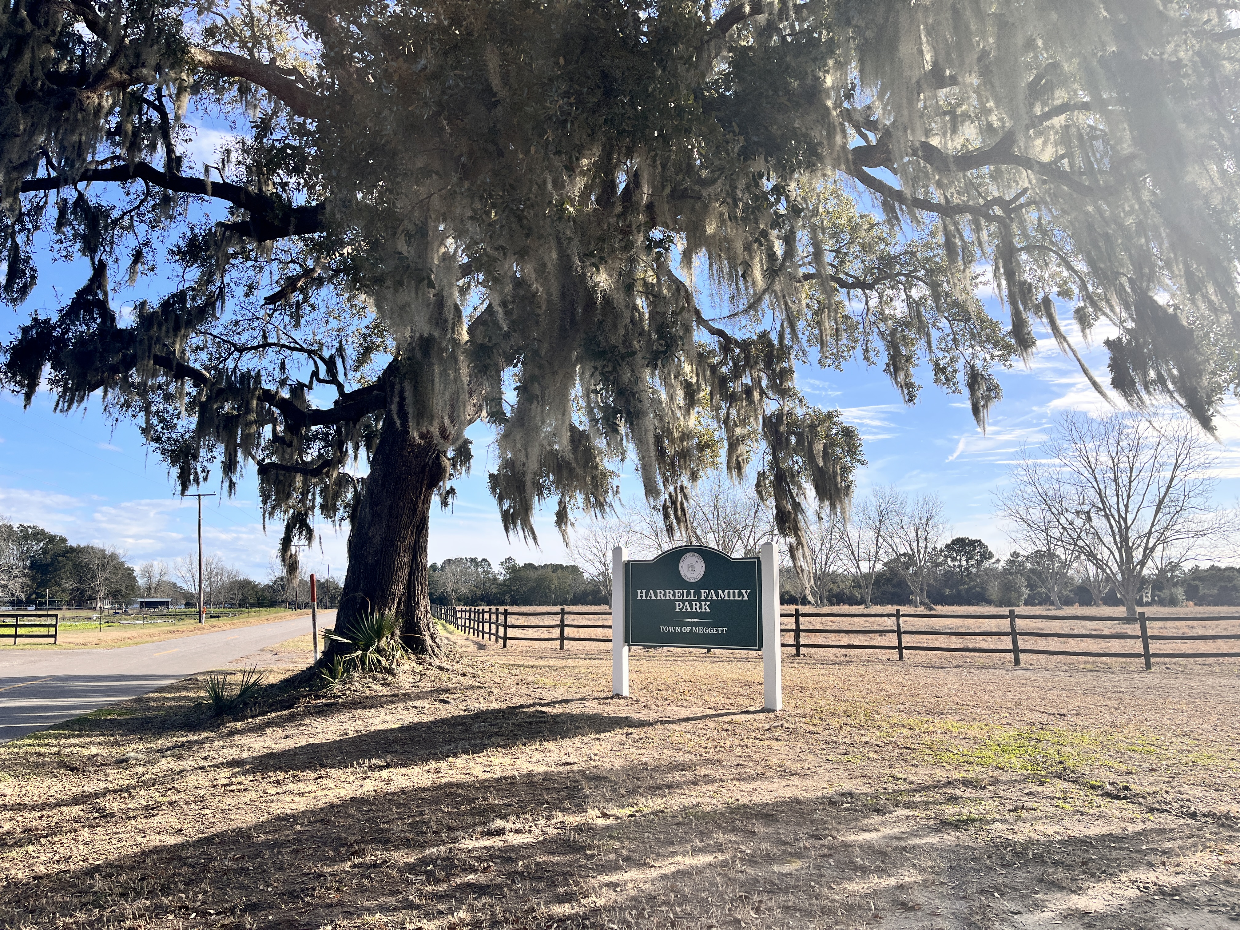 The Town of Meggett purchased this 161.5-acre property in partnership with the Open Space Institute Trust Inc. Harrell Family Park is located at 4708 Gibson Road in Meggett, SC. The property features several majestic Live Oaks situated on a tributary of Ellis Creek, and there is a dock providing visitors access to the creek for fishing and crabbing